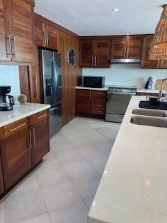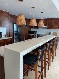 Kitchen includes full size stainless refrigerator, 6 burner stove, oven, microwave, coffee pot, blender, toaster, pots and pans, dishes, glasswear, flatwear, kitchen utensils. Everything you need to make it a home away from home!