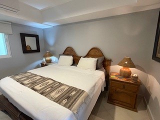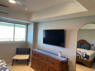 After a full day in the sun, unwind in the master bedroom with a comfortable king sized bed, premium linens, room air conditioner, ceiling fan, large tv with streaming service, full length mirror, room darkening remote-operated window shade, and closet with plenty of storage for your stay. Updated ensuite bath with walk in shower, rain/handheld showerhead, exhaust fan/light, vanity lighting, plush towels, scale.