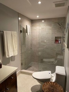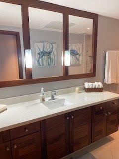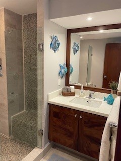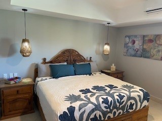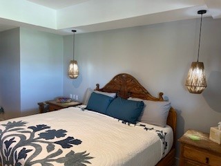 Accommodate two in the guest bedroom with two twin single beds, or use the bed topper to make a king bed. Premium linens, room air conditioner, ceiling fan, room darkening window shade. Updated guest bath includes a large walk in shower with rain showerhead, exhaust fan/light and plenty of plush towels.